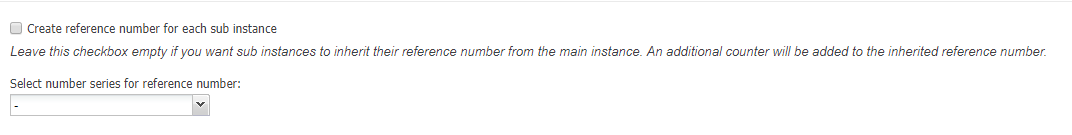If the checkbox is left empty, the sub instance will receive the same reference number as the main instance, but with a counter added to it. For example, if the main instances reference number is 001, the sub-instance may be 001.1.