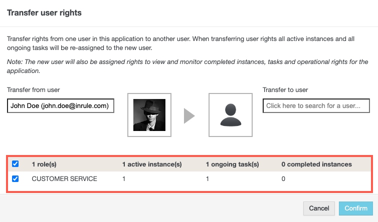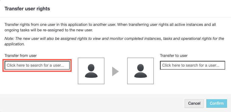This feature allows application administrators to replace one user in an application with another user by transferring all instance and task permissions from one user to another. It is also possible to transfer a user's permissions in a specific role to another user.