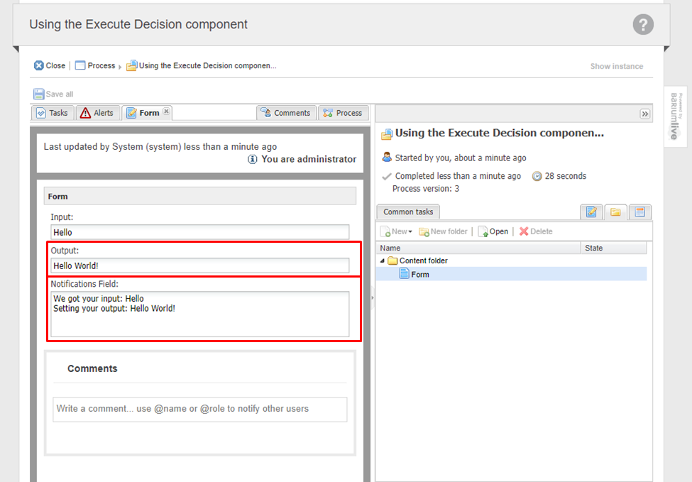 Once the Execute Decision component has been configured and added to a process model, it can call a Rule Set or Decision when executed. After starting a process, the form data will be sent to the execution service, which will perform any changes and return them to Process Automation to update the form. For example, in a rule application that contains a simple decision that modifies input and writes notifications, the form may start like this: