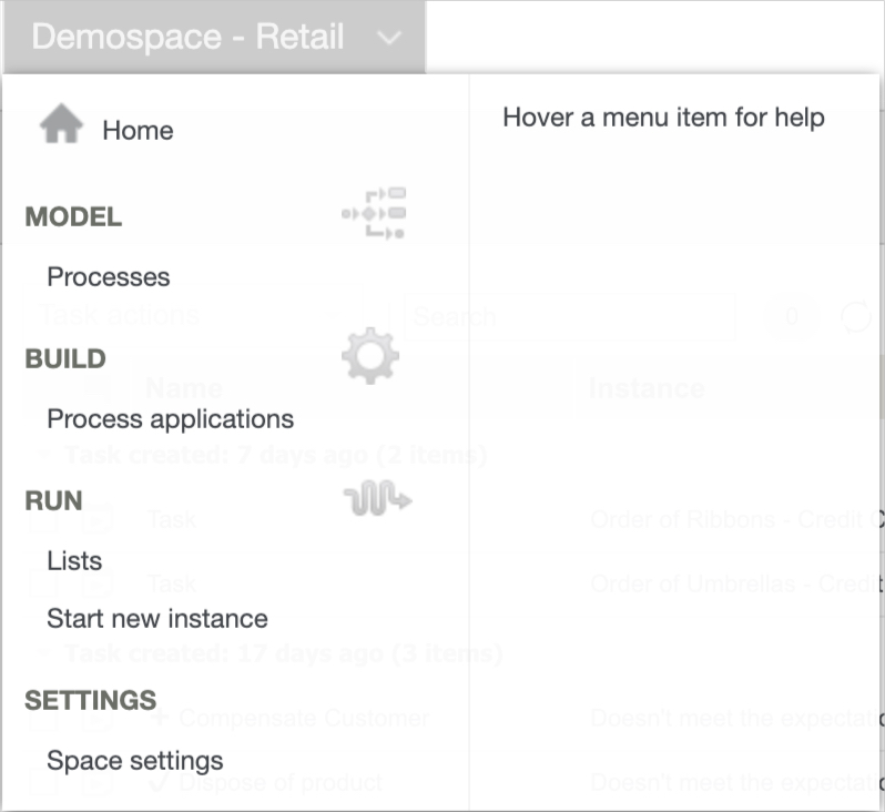 All spaces are separated from each other so that you only see and work with the relevant processes that exist in the space. This allows you to divide your work into logical compartments so you can organize your processes more effectively. Create spaces for specific processes, projects, business areas, and test spaces.