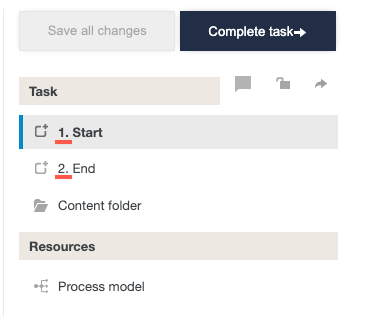 If you have a task with multiple forms associated with it, they will appear in the order in which they were dragged onto the task when modeling the process. In the example below, the form named End was dragged onto the canvas before Start, which is why it appears first. The forms do not appear in alphabetical order.
