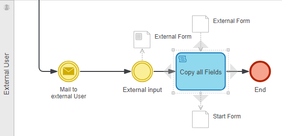6. (Optional) If you want data from the external form sent back to the form used earlier in the process ( Start form in this example), add the script component Copy all fields to the process after the intermediate event where the external form is created. As long as the fields in both forms have the same name, data from the external form can be sent back to the first form ( Start form in the example).