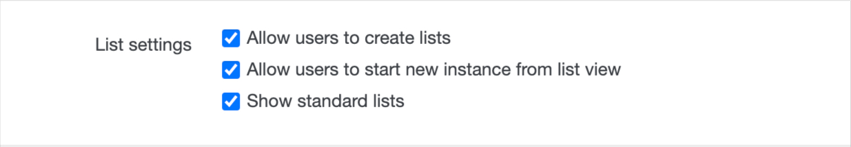 If you do not see the All instances list and would like to, it will need to be turned on under Space settings. Only administrators have access to Space settings. Administrators can turn standard lists on or off by going to Space settings and scrolling down to List settings. Do not forget to select S ave changes when you are complete. Choosing this setting will automatically generate the lists: My tasks, All instances, and My started instances.