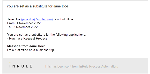 When a colleague enables the Out of office function and adds you as a substitute performer you get an email stating the from and to date, a message, and the name of the regarded application(s).