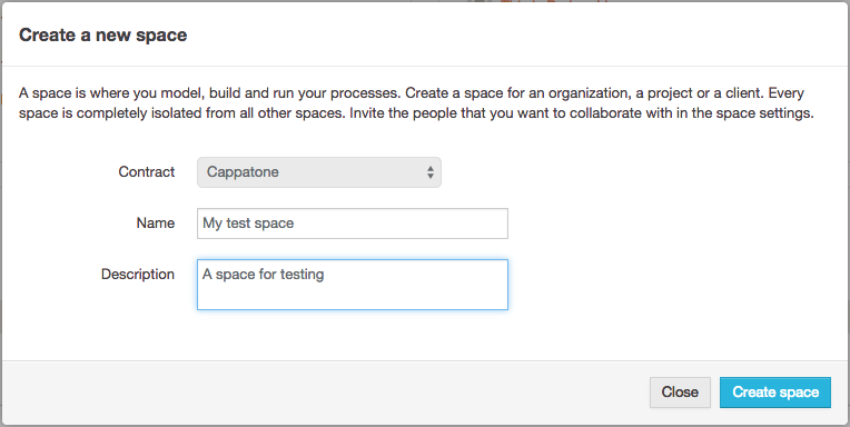 All spaces are separated from each other so that you only see and work with the relevant processes that exist in the space. This allows you to divide your work into logical compartments so that you don't have one long list of every single process that you have access to. Create spaces for specific processes, projects, and business areas, or just have one where you can test new processes without mixing them with your live processes.