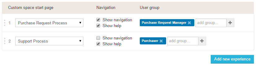 Multiple space experiences can be configured so that different people can have different experiences. This is done by adding a new Space Experience and selecting another group the custom space experience setting is for.
