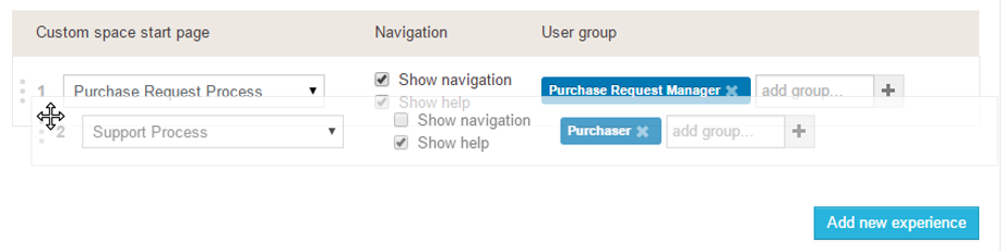 If you have multiple custom space experiences with group settings and one or more users are a member of more than one group it's possible to prioritize the custom space experience by dragging and dropping them to choose a priority. Simply click and hold on the three buttons found on the left of the space experience and drop it above or below another row and they will re-organize.