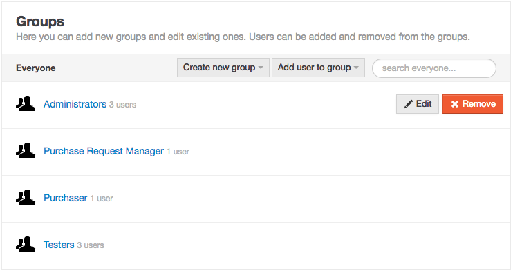 To remove a user from a group, click on the group that you wish to remove a user from. All users that have been added to the group will be displayed. Hover the cursor over the user you want to remove and select Remove from group.
