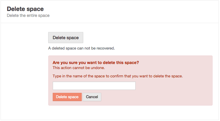 If you no longer want a space you can delete it here. All process models, apps, activities, forms, and information will be deleted and cannot be restored if you do this. Deleting a space is only possible if you are the space owner.
