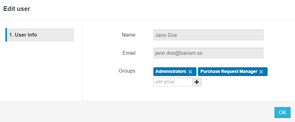To edit the groups a user is a member of, click on the user's name and edit the groups in the appearing window.