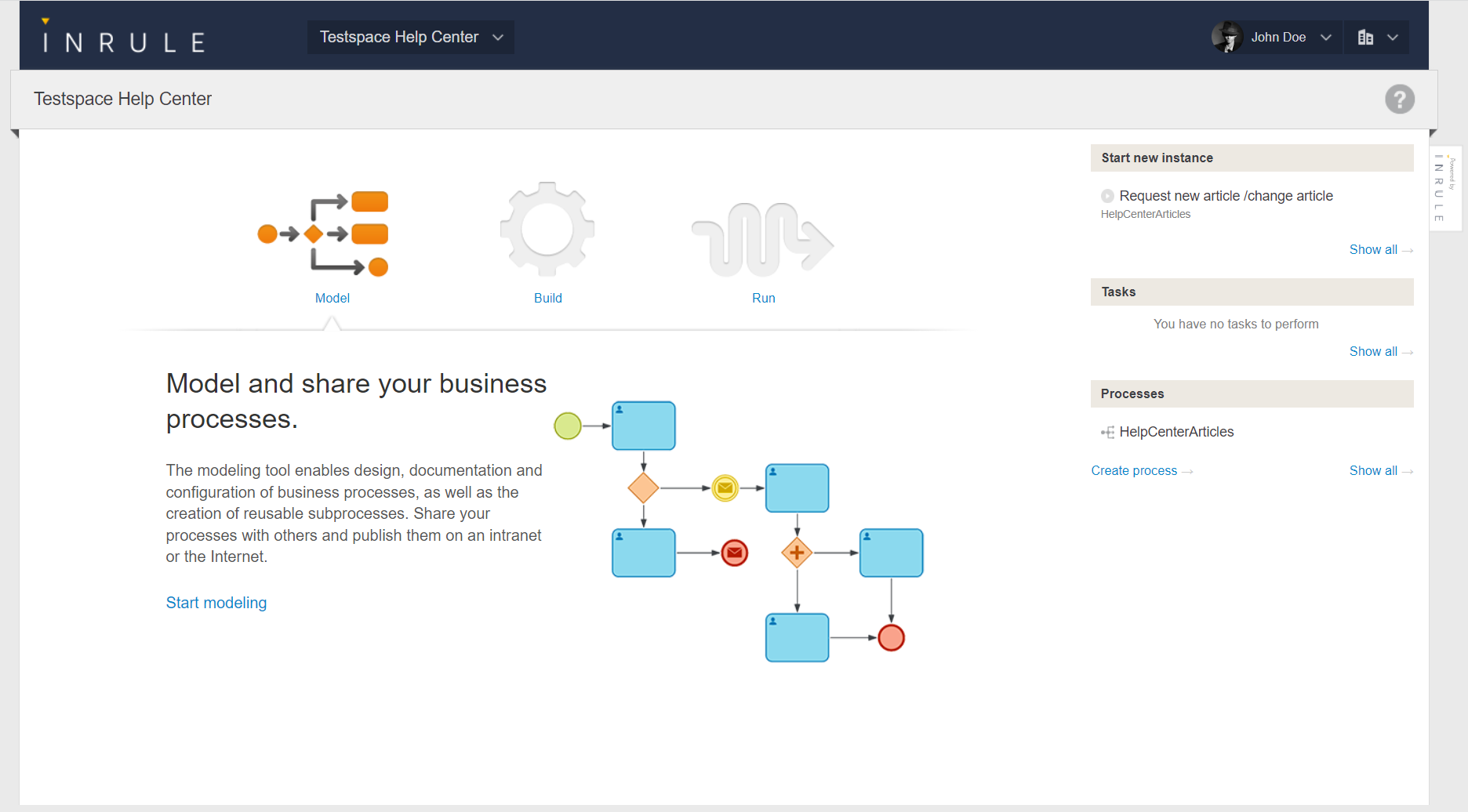 By default, the Space start page contains the Model – Build – Run icons, describing the Map to App flow. In the space setting Show on start page (see below) you can choose to display one of the space processes or the list view instead. With using process models. the space start page helps guide users like a management system. Users can click on the process map to open sub-processes and documents. See the start page examples below. Using the list view as the default start page can be very useful for users who mostly work with tasks.
