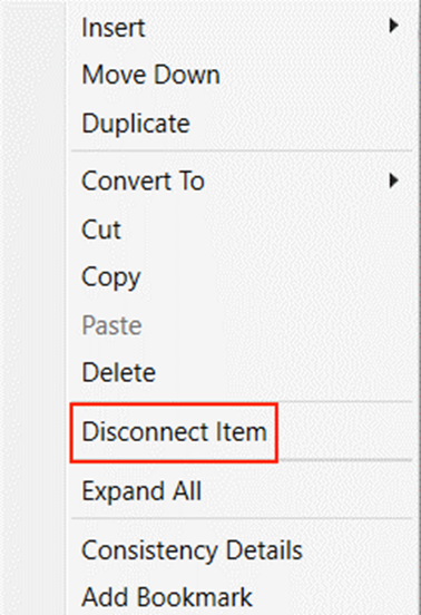 To disconnect an item, either right-click the item in the Entities view and select Disconnect Item (Figure 1) or select the item and click the Disconnect Item button in the Process Automation tab (Figure 2).