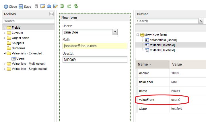2. In order to reference corresponding columns after making the initial selection in the main field, simply add as many fields as you wish and add the attribute valueFrom and type in the name of the field followed by the name of the column. For example, employees.B