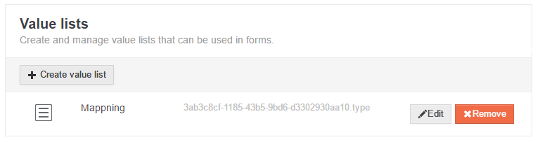 Value lists are exclusive to only one space. When you have one or more value lists in a space they will be presented like in the picture below. You are free to edit or remove lists using the buttons to the right. If the list is used however, a warning message will be issued and you will not be able to delete the value list unless you've freed up its connections.