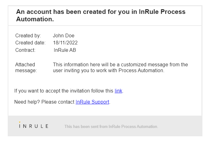 The emails you receive may be different from the example below, depending on how you were invited to Process Automation.